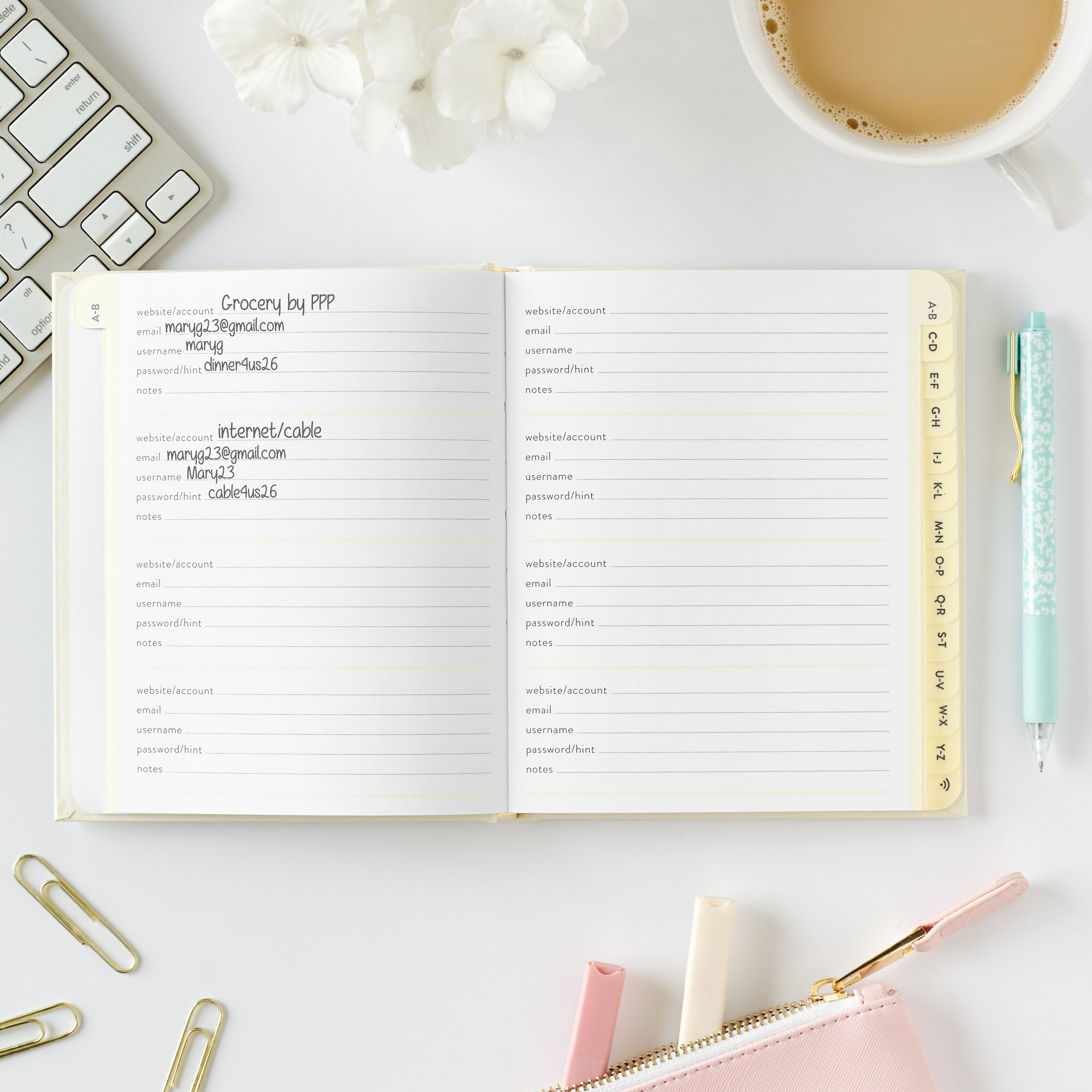 Tired of forgetting your password? Our stylish password book is a stress-free solution to keep your digital life organized! Quickly flip to the correct page to find your login details in seconds - no more second guessing, endless searching or clicking that dreaded “forgot password” button!