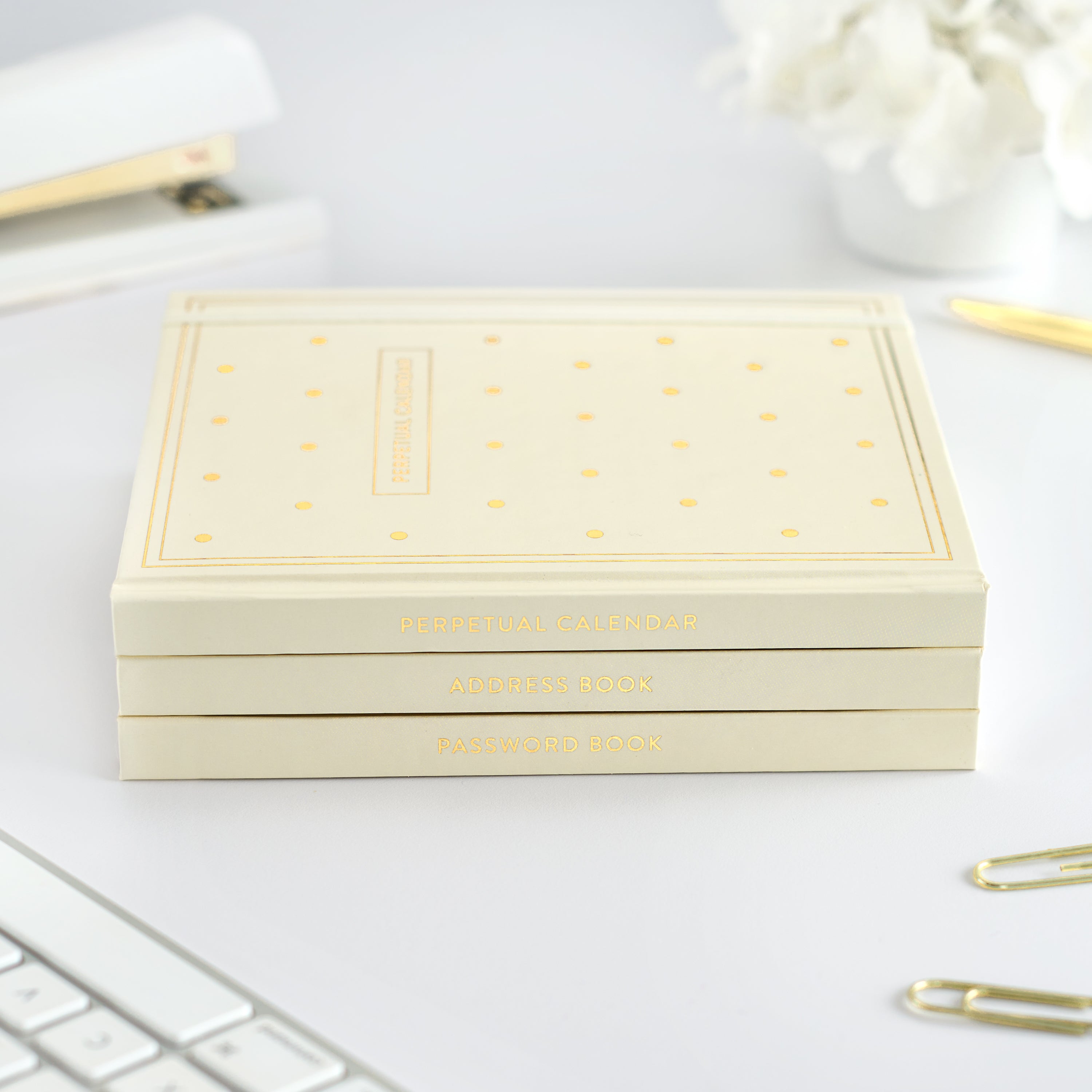 This beautifully coordinated organized life trio kit is your new go-to for keeping life organized! You can easily manage all of your logins, keep track of your important contacts and remember all of life’s milestones with these essentials. The matching covers are stylish enough to leave on display and are a thoughtful and practical gift for holidays, weddings, housewarmings or just because!