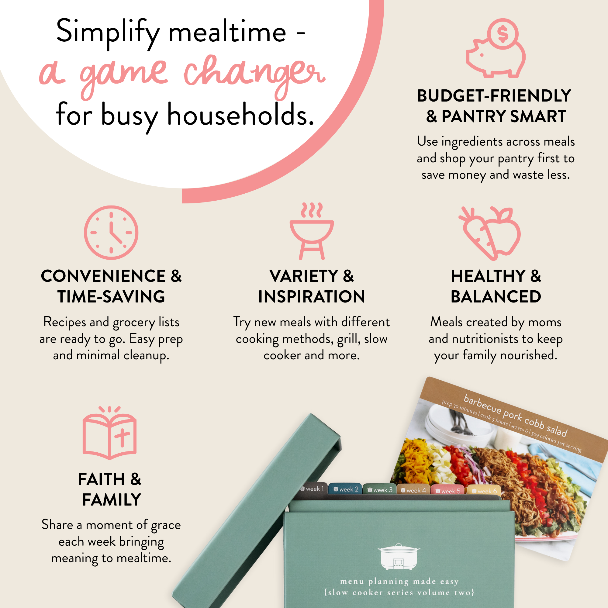 Slow cookers just make everything easier, and this meal plan by PPP was created for that very reason! Packed with 12 weeks of recipes your family will love, step-by-step instructions, and even grocery lists to make shopping a breeze, this happy box really makes meal planning easy. With 72 delicious recipes at your fingertips, there will be no more stress about what to make for dinner. Follow each week in order, or just pick out a couple of recipes to start with— whatever suits your family’s needs!